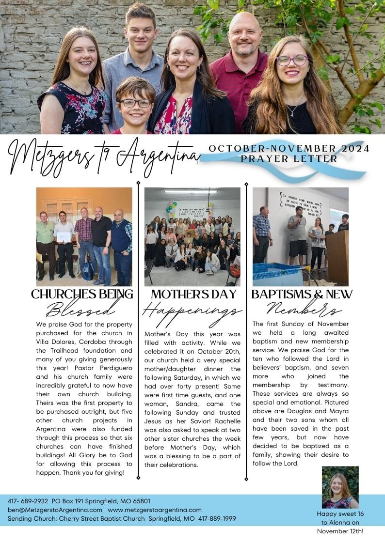 September 13 marked an extremely large milestone in our personal lives: Our oldest daughter, Natalie married her sweetheart, Facundo Ibarra. They met at church and were friends for almost a year before letting their interest in each other be known, and now two and a half years later were finally ready to become man and wife. It was a bitter-sweet time for us, as everyone who has married off a child knows, because our family home dynamics changed from six down to five, and our little girl is now a married woman. We are so very happy for both of them. Please be in prayer for them as they make decisions on how to continue serving God together. If you would desire to send them a wedding gift you can send it through us earmarked for Natalie and Facundo’s wedding.